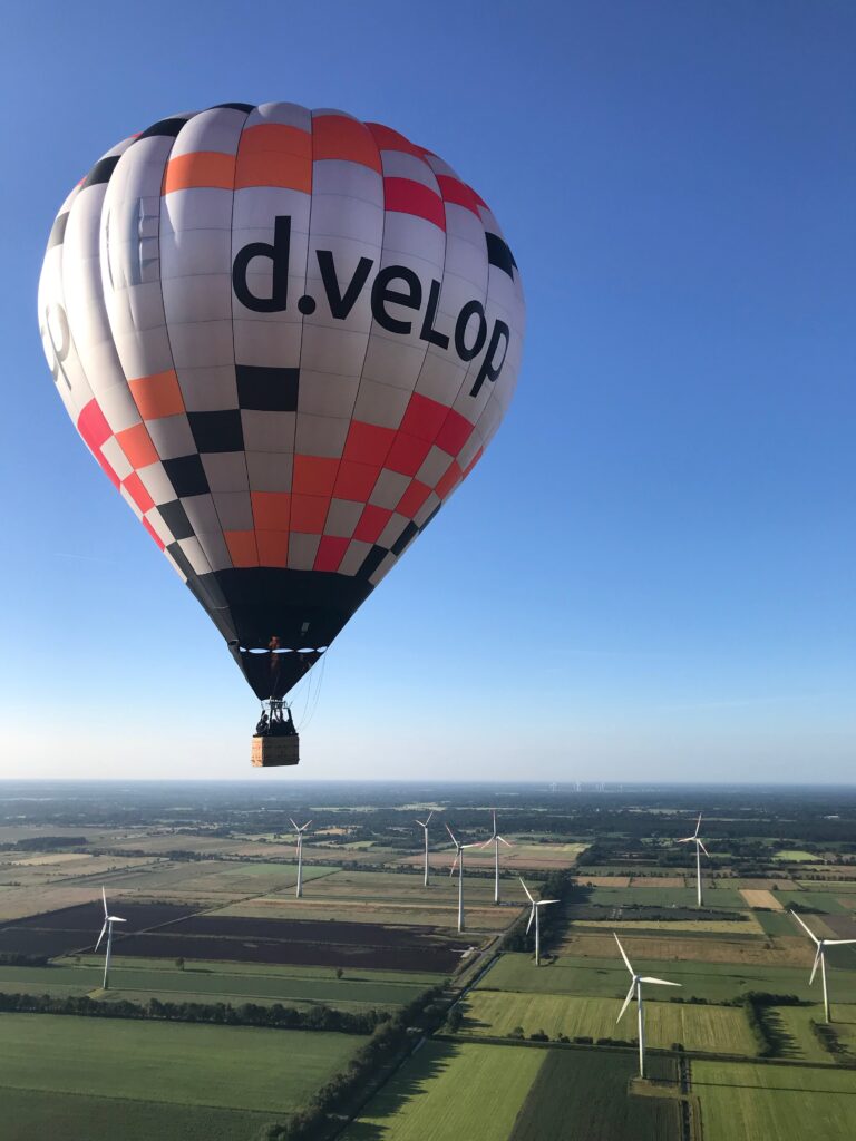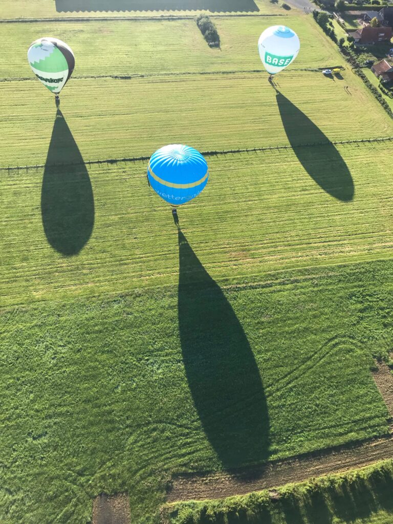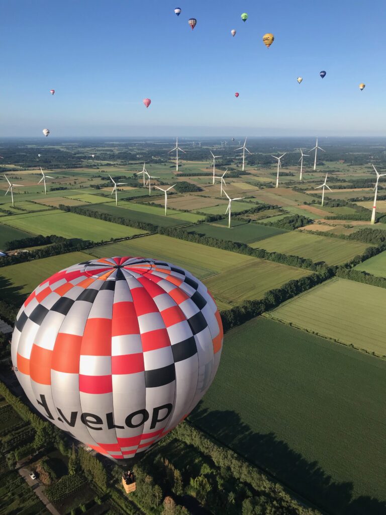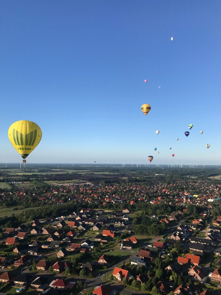 Und neben allen anderen Unwägbarkeiten, kann Ballon fahren auch ein ausgesprochen kurzes Vergnügen sein. Während wir noch vor einem Windpark an Höhe aufnehmen, ist für manche Teams (und Fahrgäste) die Fahrt schon vorbei, bevor sie gefühlt richtig begonnen hat. Wir sind über eine Stunde unterwegs und genießen einen herrlichen Ausblick über Ostfriesland.